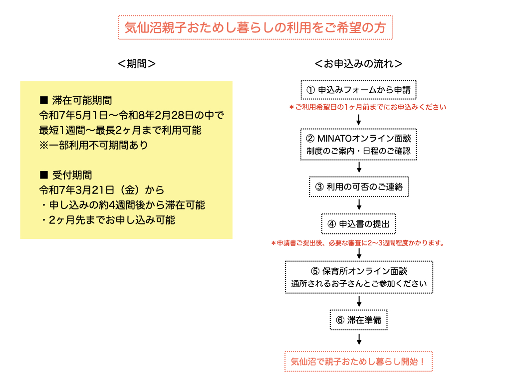 ・お申し込み状況によっては、ご希望の滞在日程に添えない場合があります。詳しい日程調整は面談時に相談させていただきます。