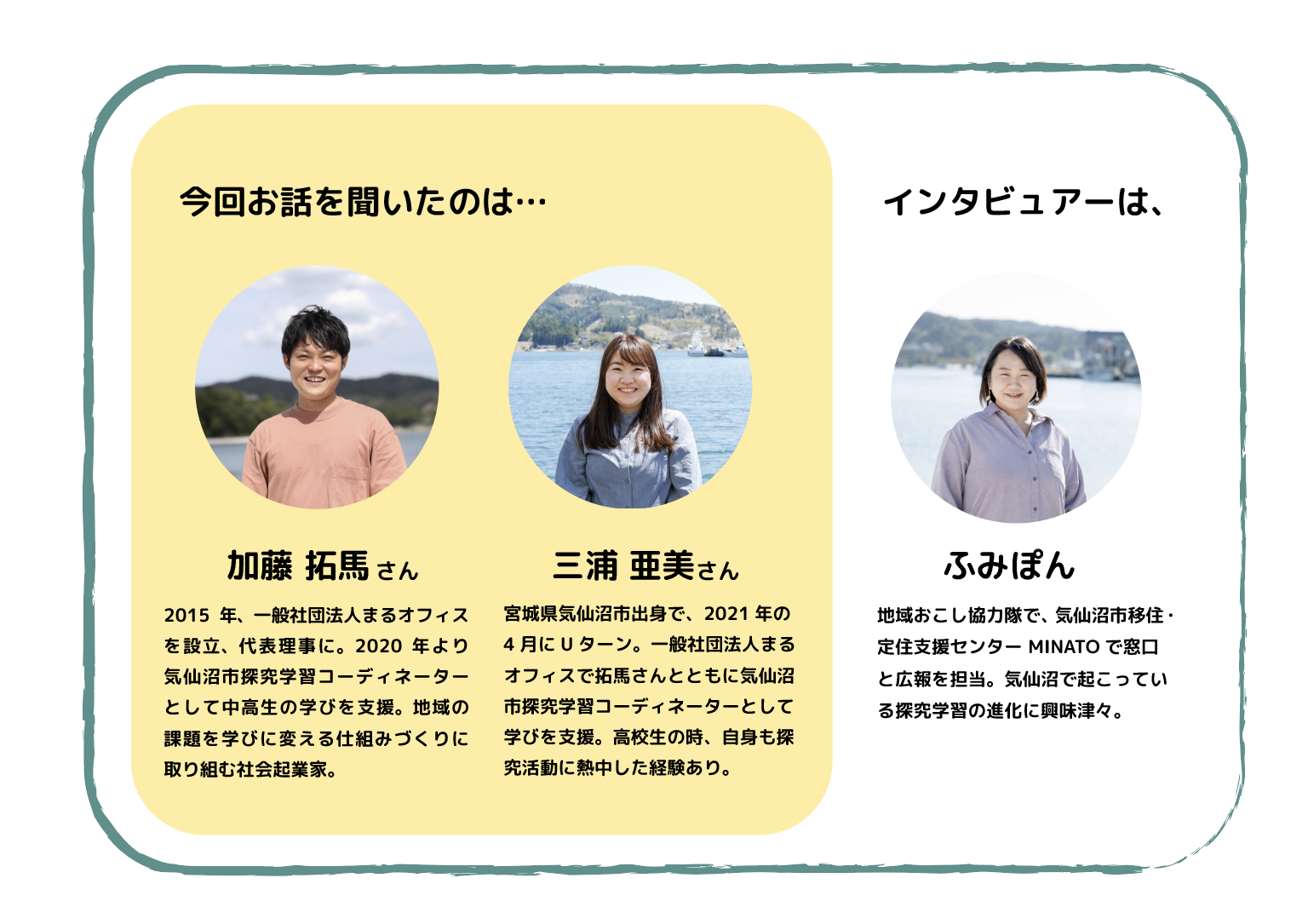 詳しくはこちらをご覧ください。拓馬さんや亜美ちゃんと一緒に、気仙沼の学びをより豊かなものにアップデートしていきませんか?