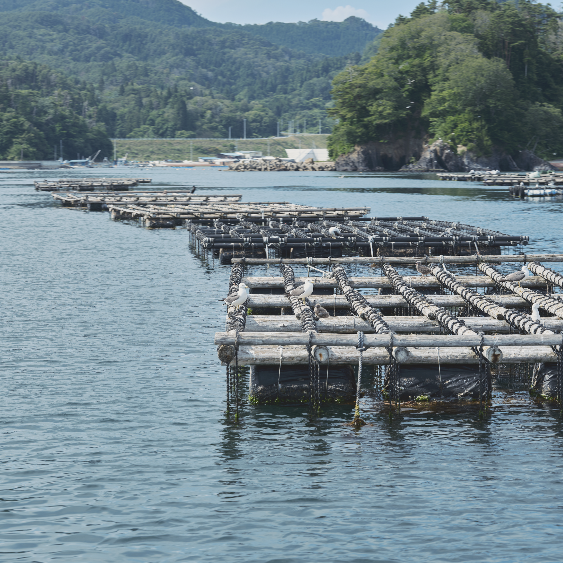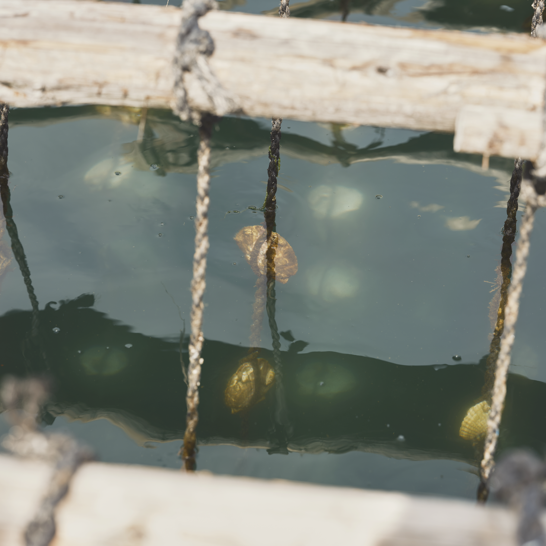 ゆらゆらと海面に揺れる、丸太に吊るされた牡蠣たち。
