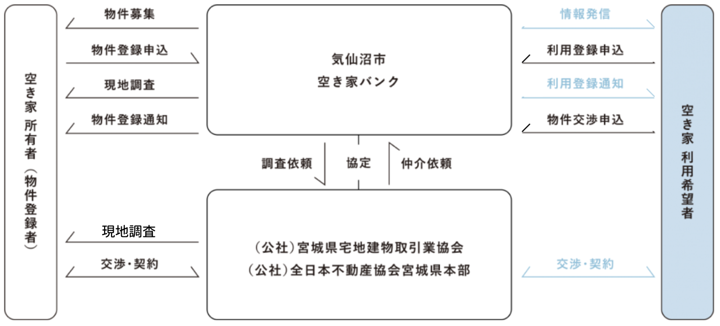 空き家バンクとは、空き家を「売りたい・貸したい」方と「買いたい・借りたい」方をマッチングさせる空き家情報登録制度のことです。市内の空き家を有効活用し、住宅再建でお悩みの方の住まい確保、市外からの移住・定住者の促進、さらには、企業の従業員確保対策にも活用いただき、地域活性化を図るための制度です。物件に関する契約交渉は、市内の協力不動産業者が行います。市は公益社団法人宮城県宅地建物取引業協会と公益社団法人全日本不動産協会宮城県本部の2者と協定を締結しています。