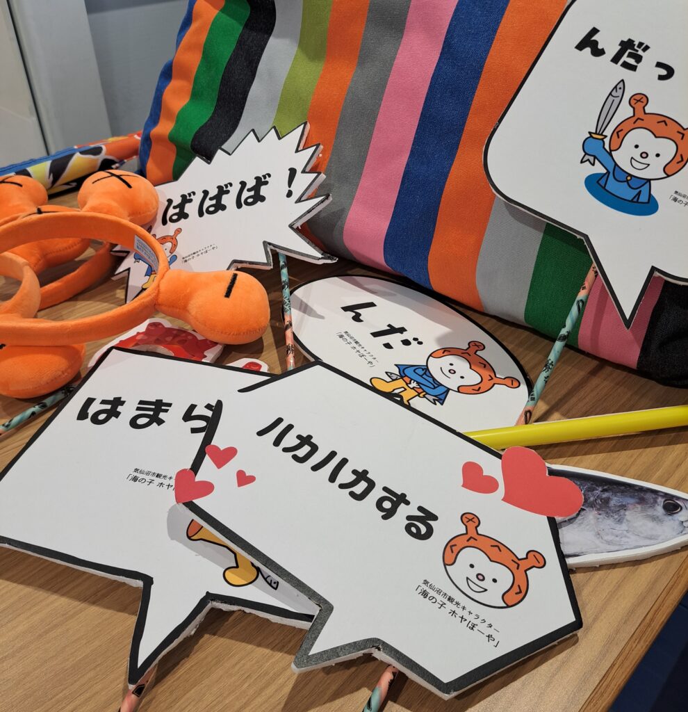 気仙沼らしさたっぷりの記念写真ブース!「ばばば!」「はまらいん!」などのフォトボードや、長い漁に出る船を見送る文化「出船送り」に使用される福来旗(ふらいき)を手にチェキ撮影。📷みなさん良い笑顔でした!