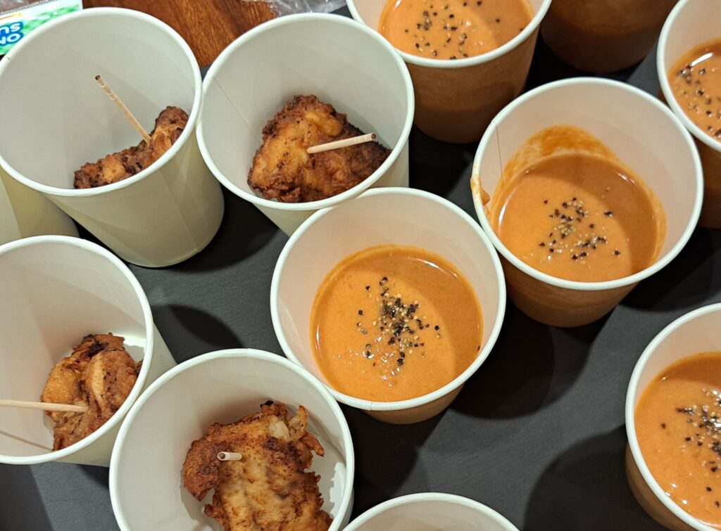 気仙沼のおいしいを味わう時間!株式会社カネダイさんの「かにのビスク」とシャークナゲットのおふるまいを、皆さん美味しそうに食べていたのが印象的でした。赤坂にある東北酒場トレジオンさんにご協力いただきました!