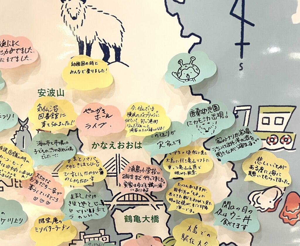 気仙沼の地図の上に、来場者それぞれの思い出を付箋に記入して貼っていき最後にみんなで共有しました。「そんな場所もあったねぇ」と懐かしむ声があがっていました。